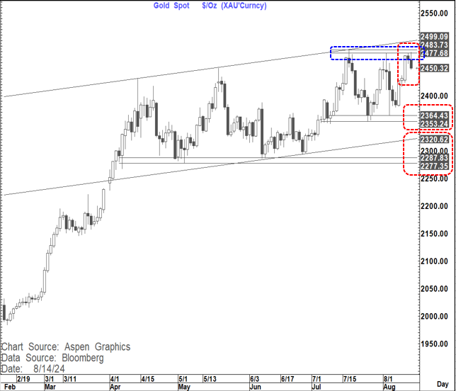 In addition, a close today, if seen, below $2,459 would give us a bearish outside day at the high of the move to go with the "triple top"