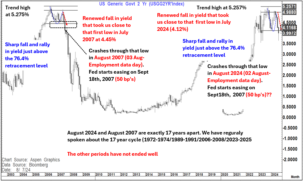 But, whether you look at this analog and backdrop (Fed rates at 6.5% and Fed stubbornly holding until January, real yields at 400 bp's, Dot Com bubble and deterioration in Employment/economic picture) or the 2007 analog (2-year yield pattern, 2 year yield inversion to 160 bp's to Fed Funds, Fed easing on 18th Sept and easing 25 each at remaining meetings that year) the suggestion is that the equity market will likely see renewed stress in the Sept-oct period.