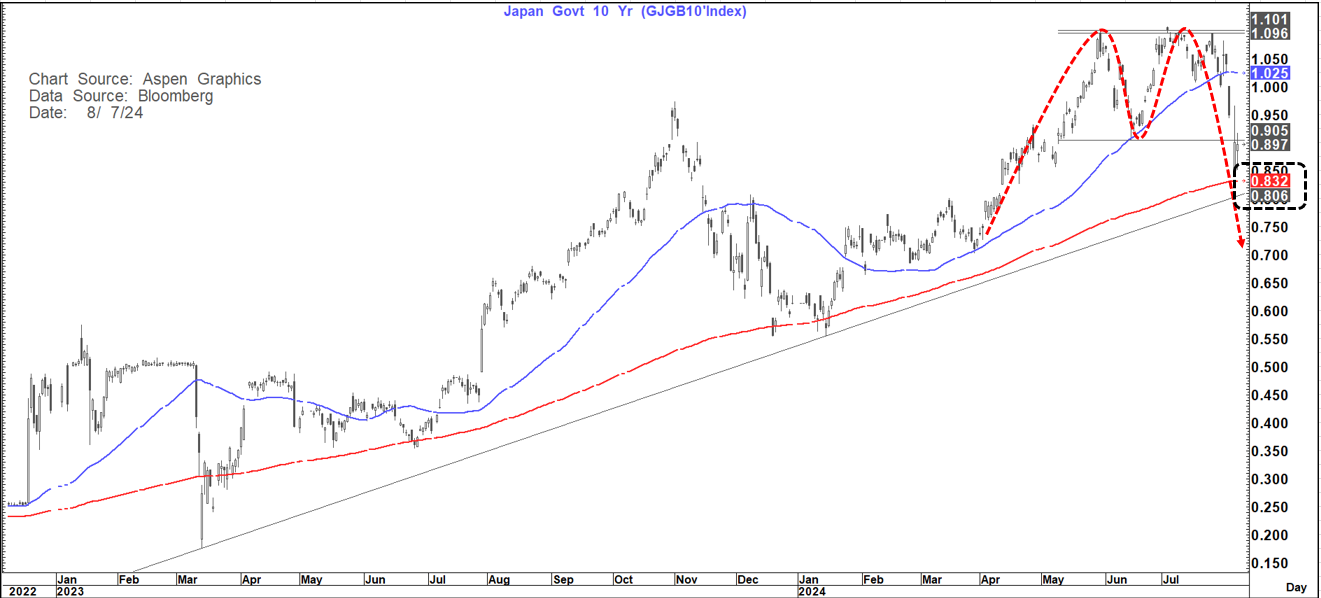 We do have a double top that suggests as low as 70 bp's with good support just above 80 bp's. As yet there are no really significant developments of note here. In 1990 we did see yields correct lower for about 2-months but ultimately, they went higher again as BOJ continued to tighten. The path this time is clearly more a work in progress