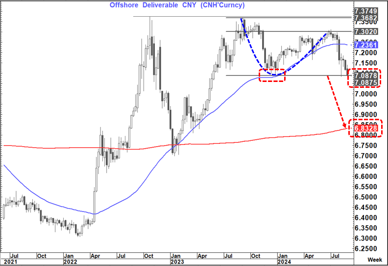 USDCNH is back testing pivotal support at 7.0875. This was the pivot off which the 76.4% pullback took place in July and therefore an acceleration point on a weekly close below.