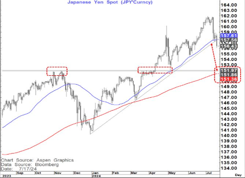 USDJPY has broken both rising trend line support at 157.56 and the 55-day MA at 157.61 with a wide gap to the rising 200-day MA at 151.36. With horizontal support also at 151.86-97 It has been above the 55-day MA since March and a close below would open up for a move to that 200-day MA. There is also a danger of a bearish monthly reversal IF we were to see a close below 154.55
