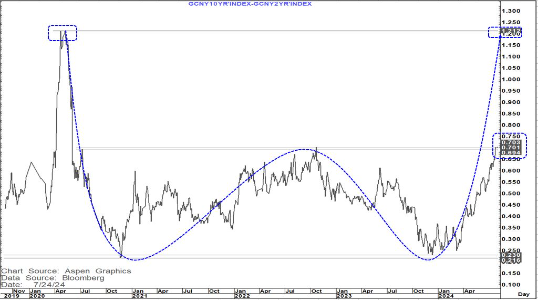 The China 2-year yield hit another trend low today at 1.529% with the China 2's 10's curve now pushing the double bottom neckline at +70 bp's. A break through here opens up a target back towards the 2020 high at 120 bp's.