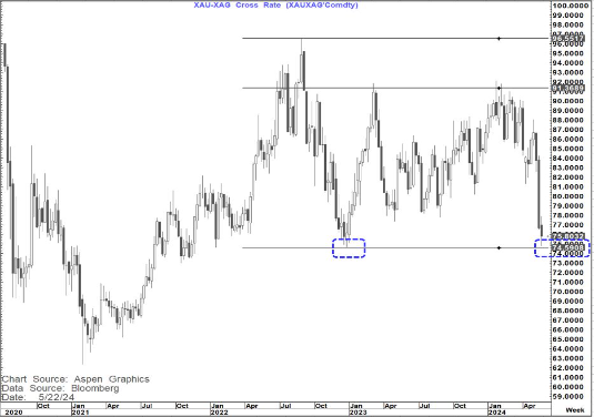 Silver does not have the same setup BUT the Gold/Silver ratio has held very good support so far at 74.59 so there is a danger it could also be susceptible near-term.