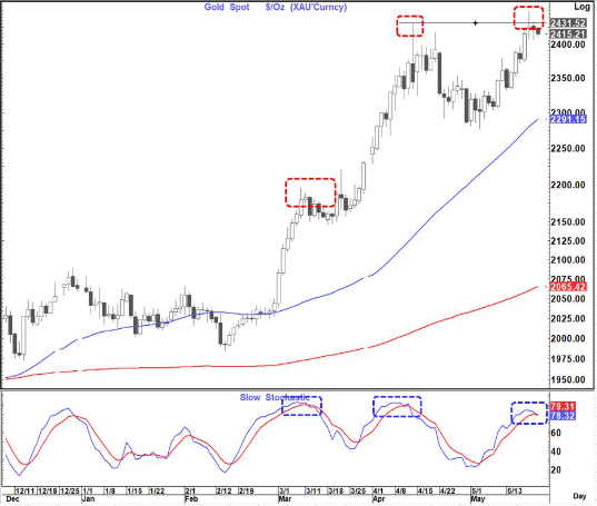 In addition, for the 3rd day in a row it is struggling to close above the 12 April trend high at $2,431.52