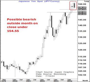 In this respect it is worth keeping a close eye on whether USDJPY closes the month below 154.55 as that would be a bearish outside month at the trend high. This has also not happened in the whole rally up from Jan 2021 (which barely missed a bullish outside month to start the trend)