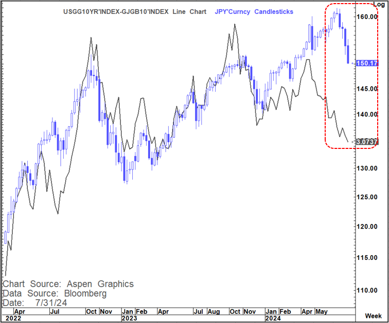 All of the above suggests that we could see a continuation of USDJPY lower, a further narrowing of US-Japan spreads and potentially a lower Nikkei (as higher yields and a stronger JPY, feedback negatively.