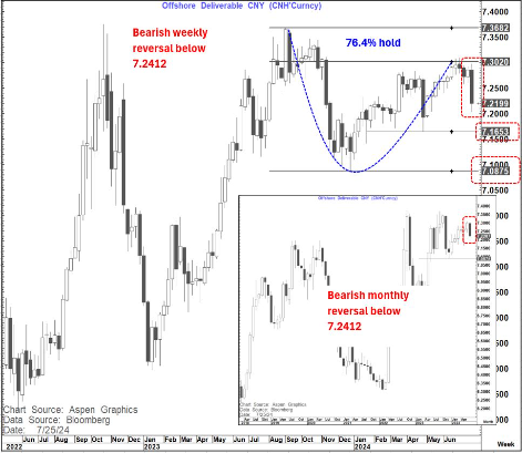 Following the hold of the 76.4% pullback level it now looks in danger of posting both a bearish outside week and a bearish outside month on closes below 7.2606 and 7.2412. respectively.