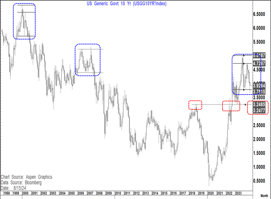 In 2024 we have had a combination of those 2 pictures. We saw the 10-year yield peak, fall sharply, and rally back up to create a 76.4% pullback in April this year. Yields then fell sharply into August and moved below that first low in but did not sustain below on a monthly close basis (so far)