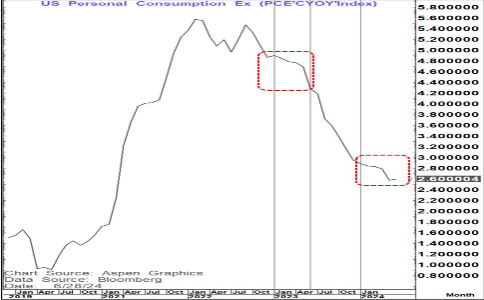 Since Sept 2022 at 5.5% annualised, Core PCE has fallen every month but one (Jan 2023)- We have clearly seen that January has become a bit of a seasonal nightmare but even in Jan 2024 the annual rate did not rise.