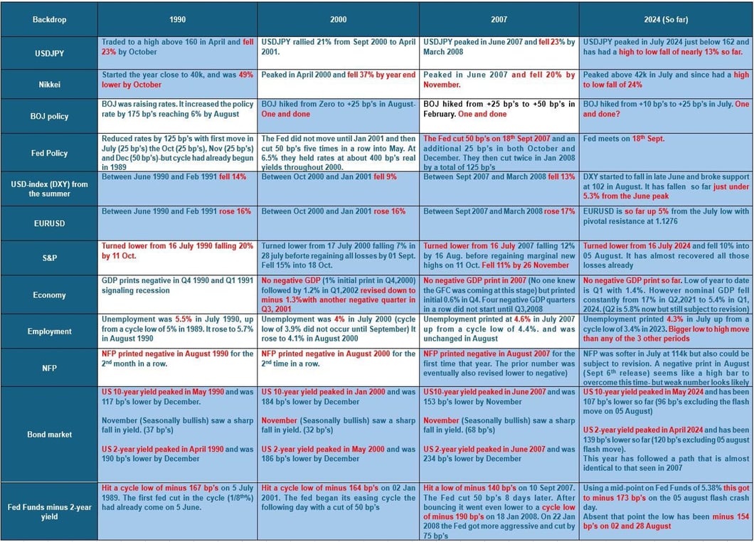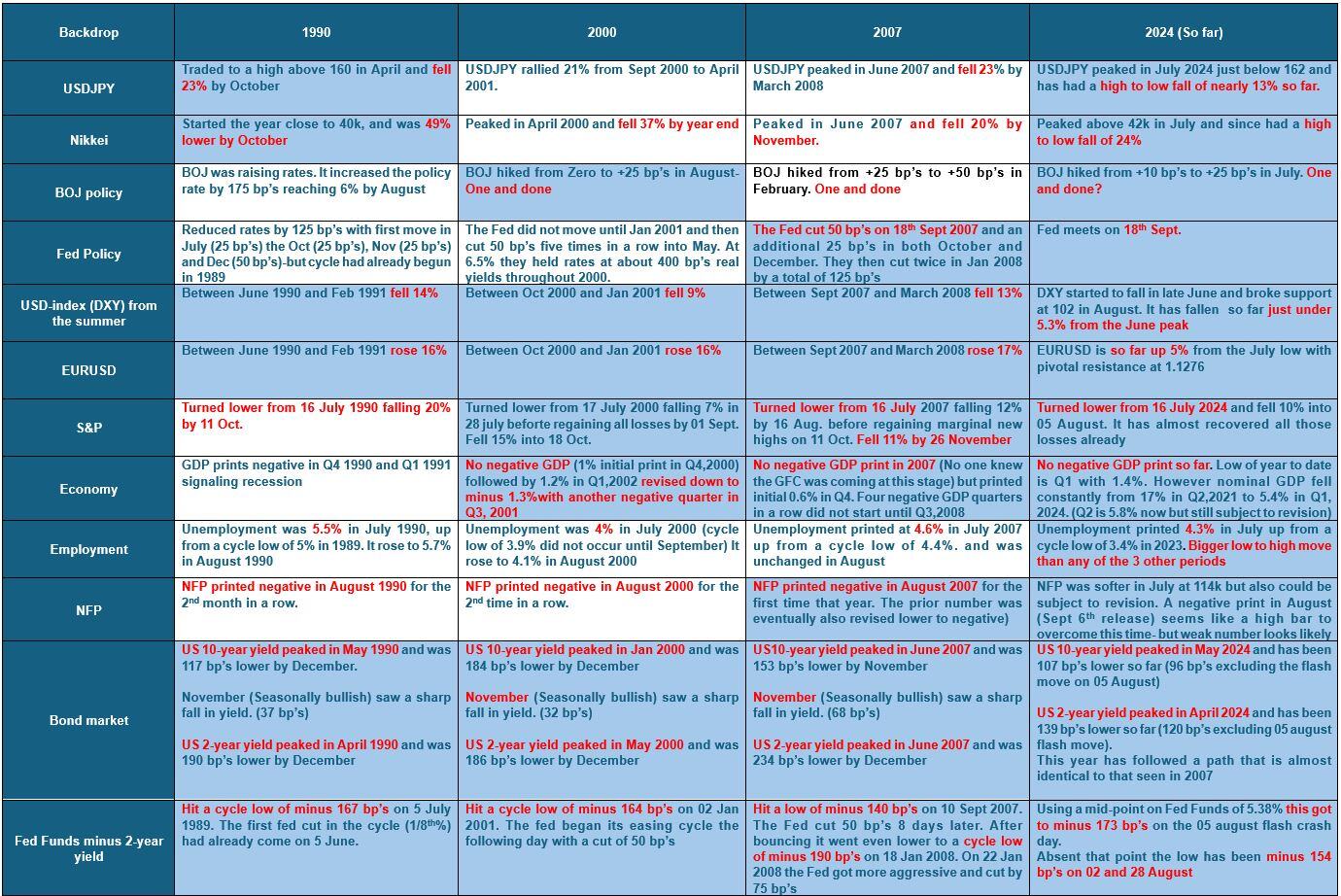 In that respect I am repeating below the 2 grids I have recently sent out detailing what happened in markets/economy/policy leading into the August employment report in those periods and what happened after the weak print.