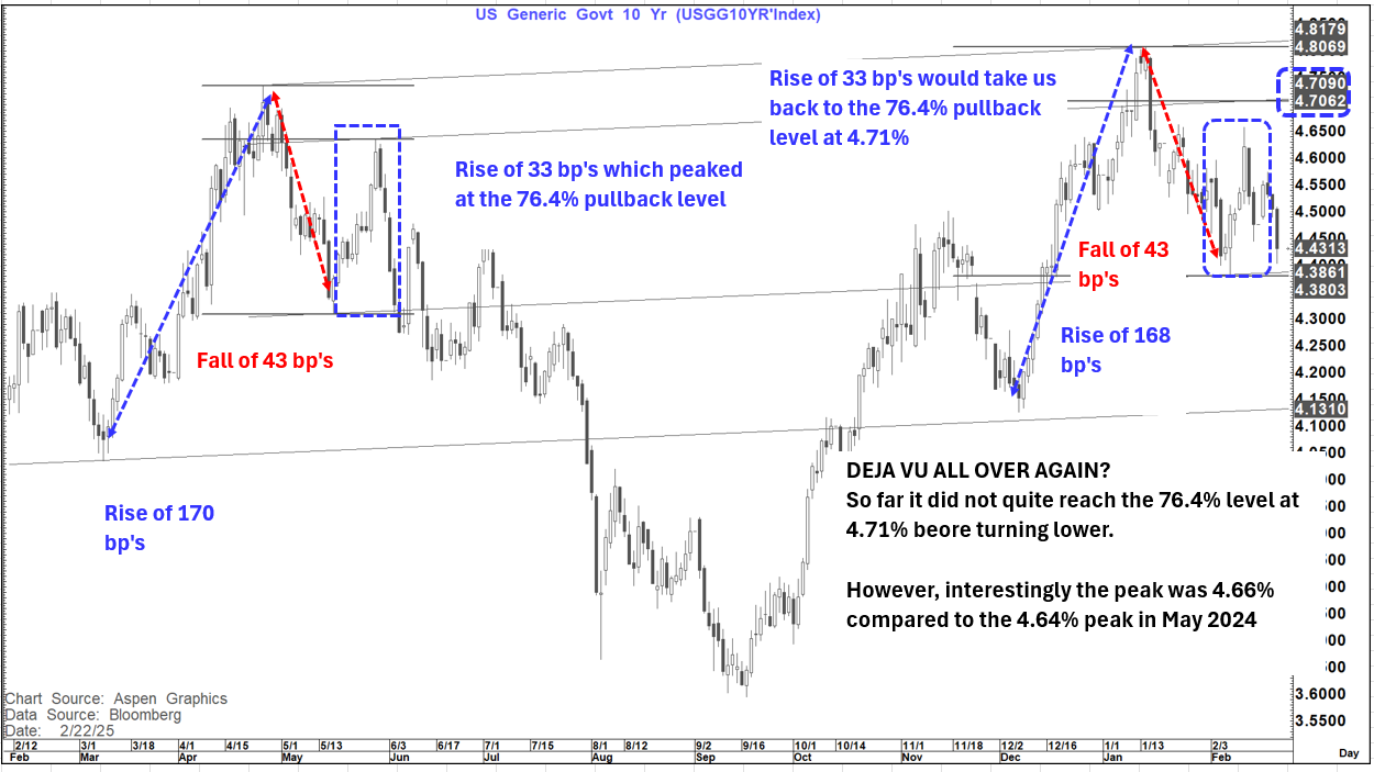 Between October 2024 and Jan 2025 10-year yield rose 112 low to high before turning lower.