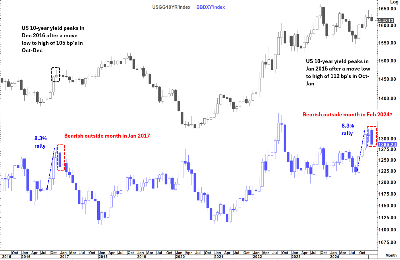 The BBDXY rose 8.3% low to high in Oct-Dec 2016, then set the most marginal of higher highs in January before reversing with a bearish outside month at the trend high.