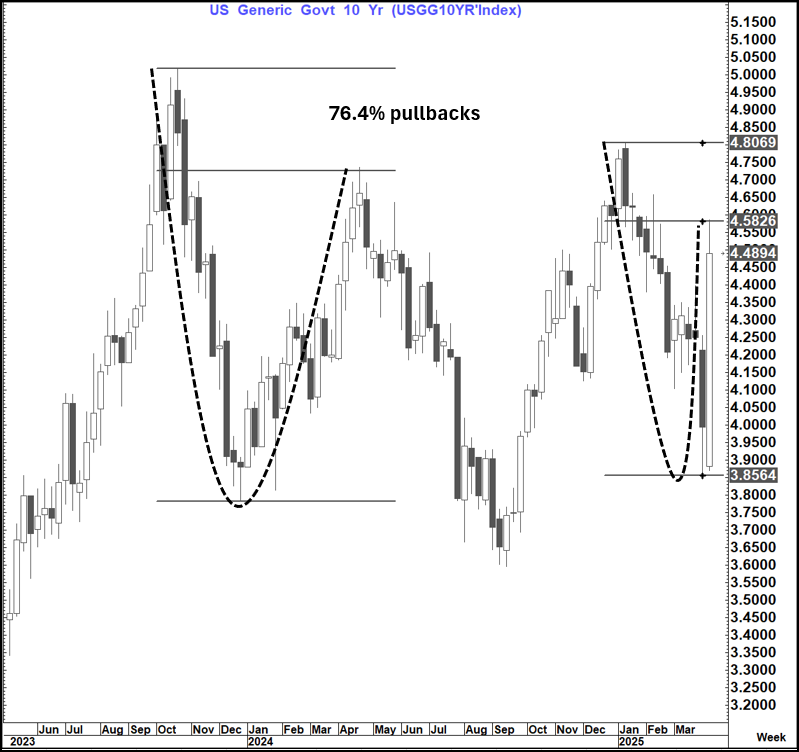 The US 10-year yield traded to and rejected the 76.4% pullback level at 4.58% suggesting at least a short-term top could be in and we could retrace back towards 4.20% again.