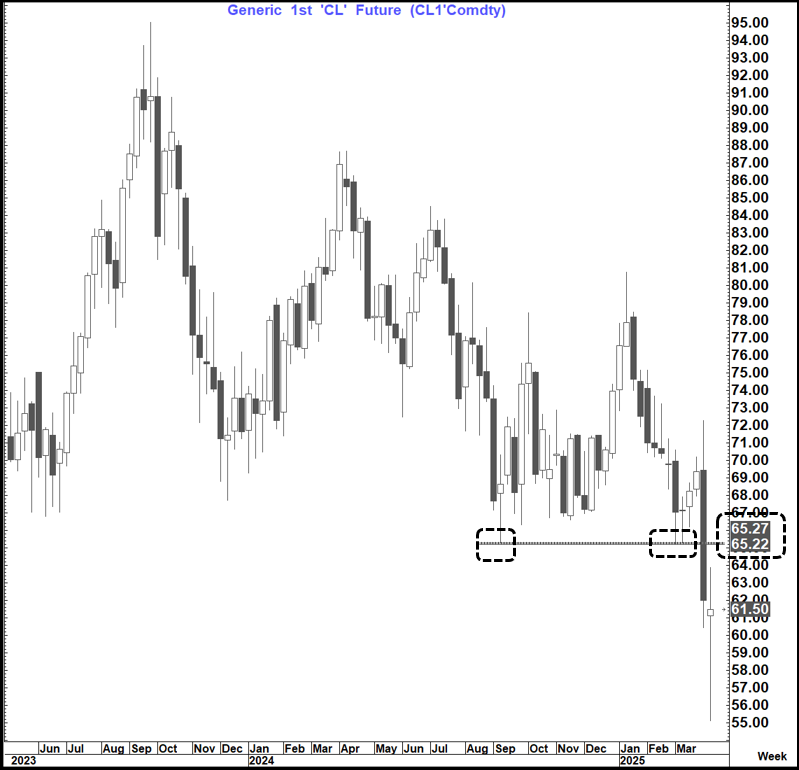 WTI is still in danger of completing a bearish outside month (Close under $65.22) which would suggest much lower levels. But in the near term I would not be surprised to see it drag itself back to or slightly above $65 again.