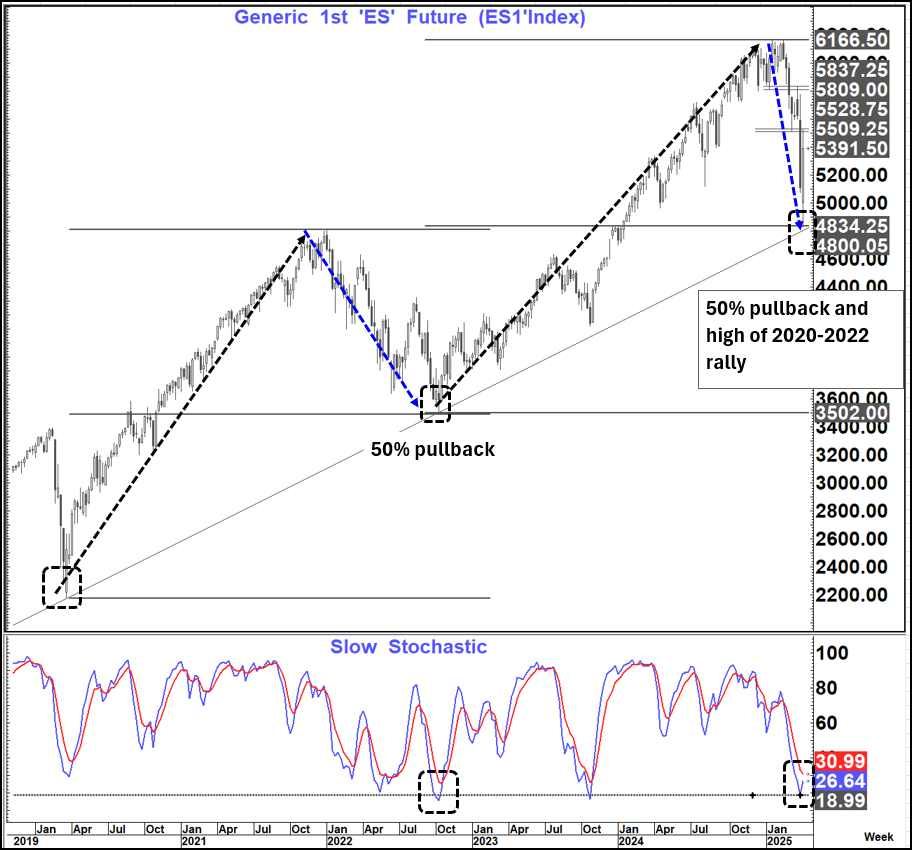 Weekly momentum is trying to turn up from similar levels to those seen in October 2022 and as I write this we are in line for the biggest up week since the bounce off the corrective low in October 2023. (5.75% back then) Es1 closed the week up 5.5% on Friday