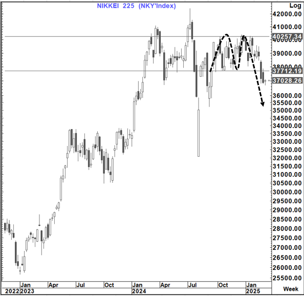 This as the Nikkei is also now coming under pressure with a double top completed suggesting a move towards 35k
