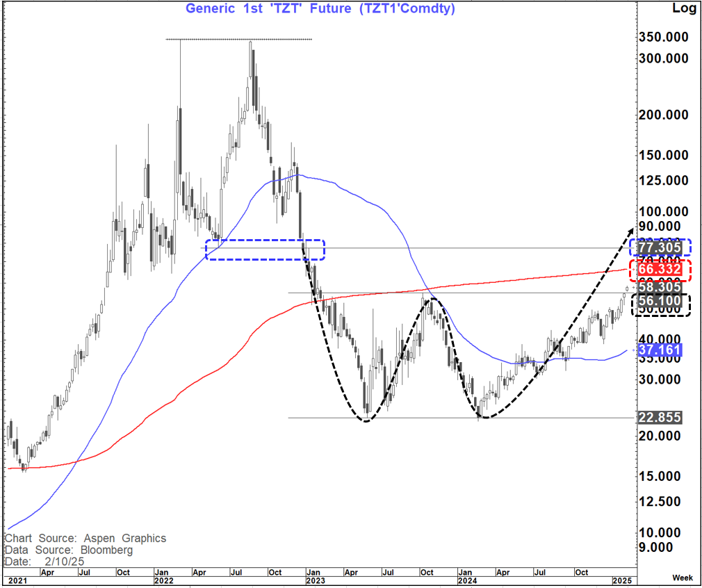 This morning European Natural Gas (TZT1) has broken above the double bottom neckline at EUR56.10. (Up over 4% on the day)