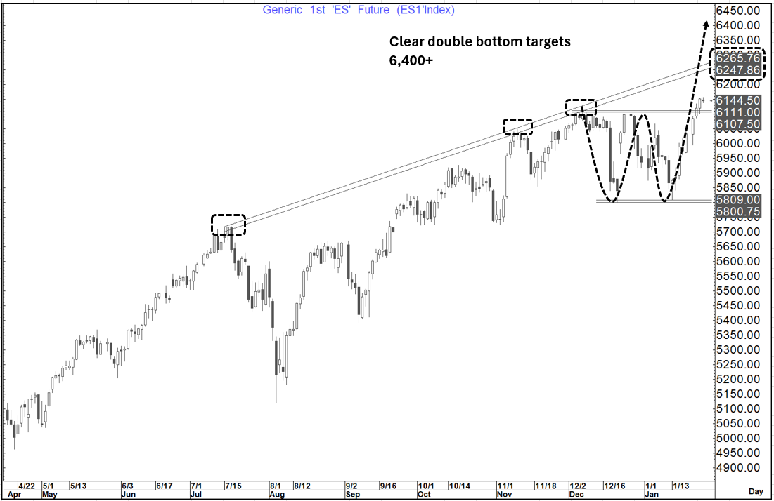 Equities remain in a bid environment, and we seem to have a clear break on Es1 which suggests a move towards 6,400+ (Similar dynamic to Q1 2017) with interim resistance around 6,250+
