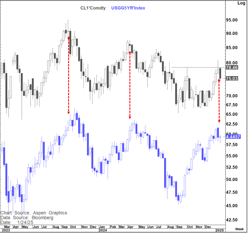 One thing very much worth watching in this respect is the Oil price. last week WTI failed to sustain a break of the pivotal $78.50 area and has since turned lower. If this turns out to be a top and we keep heading lower recent history shows that this could weigh heavily on yields.