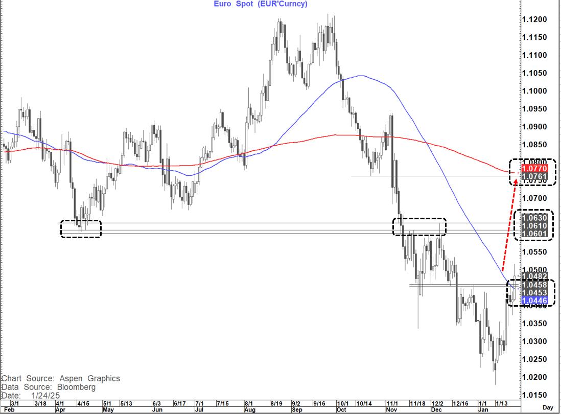 EURUSD has broken above resistance at 1.0446-1.0458, including the 55-day MA at 1.0446. IF we close above this range it would suggest further gains to the topside with first targets around 1.0630-40
