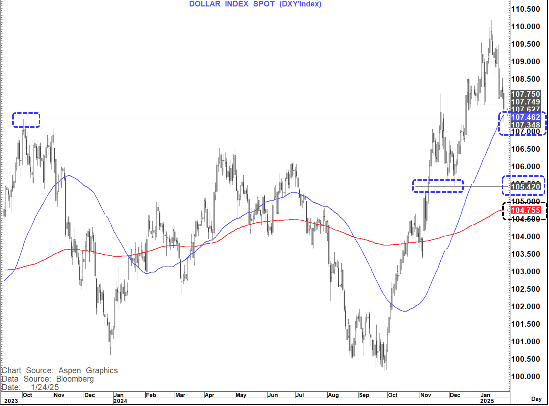 The USD-index is also on the cusp of a break with a few near-term levels still needing a break for confirmation. We are below the recent supports at 107.75 but still have the 55-day MA at 107.46 and the breakout area at 107.35 to overcome.