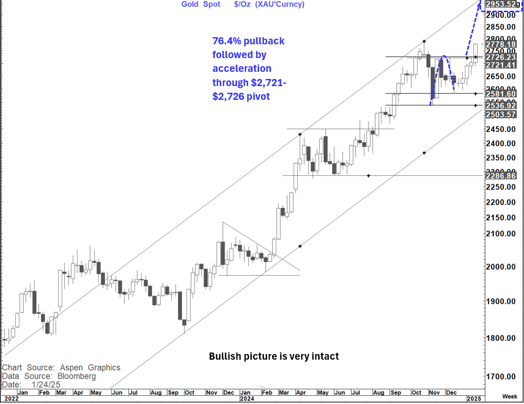 However, the picture on Gold remains very constructive as it accelerated higher after the break of $2,721-$2,726. The minimum target remains for a test of the all-time high at $2,790 but I am biased to think that we could head higher still to $2,900+