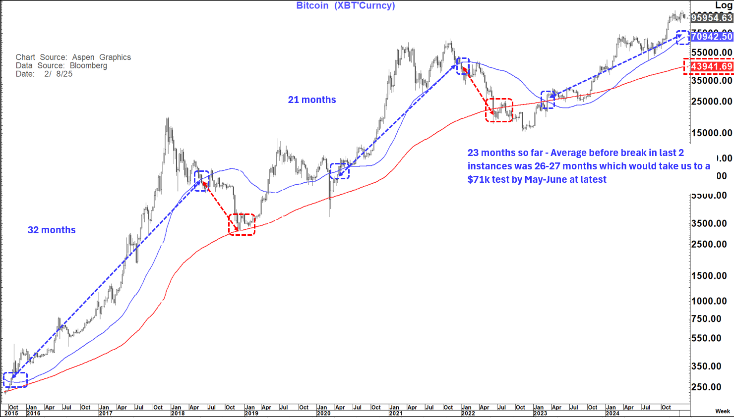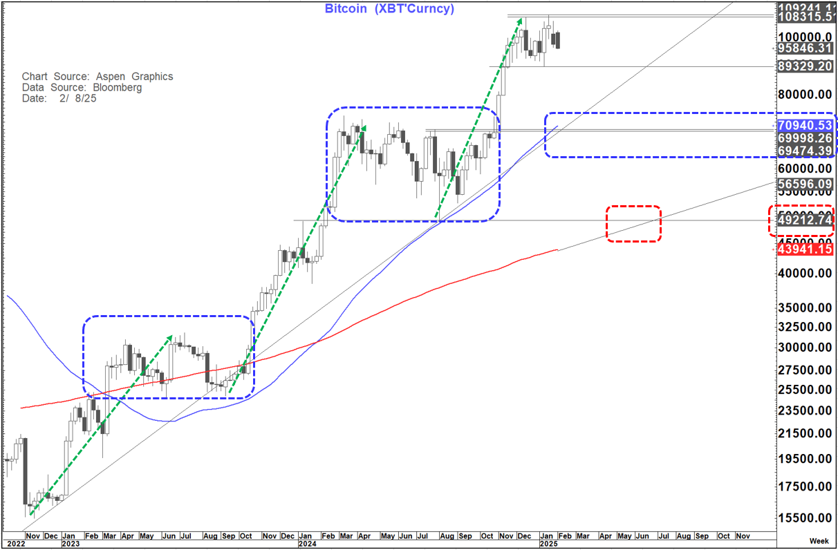 - In the last move higher since November (Around $70k) it has clearly been driven by "Trump Mania" and the belief that the US may establish a "Strategic Bitcoin Reserve". Is that before or after we Invade Greenland, Invade the Panama Canal, Invade Canada and turn the Gaza strip into a new "Snowbird" location. (all tongue in cheek comments obviously) The point I am making here is that this is something that has been talked about, but we have no idea if we should take it any more seriously than the above- not least because it flies in the face of one of the big "qualities" of bitcoin as a "safe-have" for some of the most nefarious.