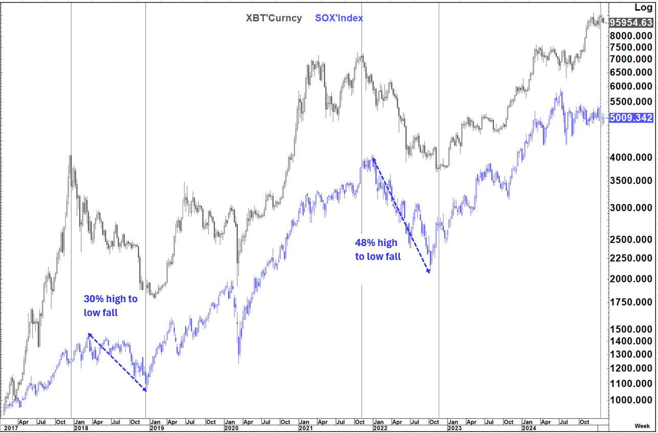 It is also interesting to look at this overlay of Bitcoin and the SOX (Philadelphia Semiconductor Index) during those prior 2 periods.