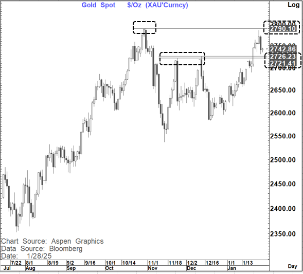 Gold has moved lower as you would expect of any "owned position" when we see a risk off event. However, for now at least it has held above the breakout area at $2,721-$2,726 which would be a good platform for another move to re-test the all-time highs at $2,790.