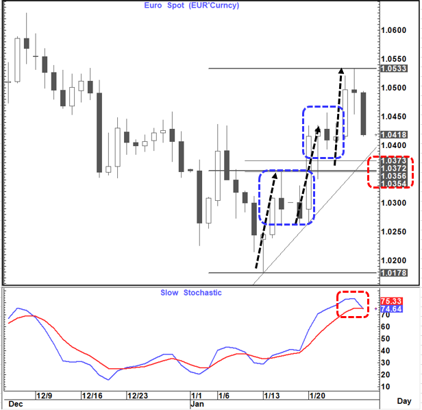 One FX Chart worth watching today is EURUSD which at this point in time looks like an evening star on the daily chart. IF this move is sustained during the day this suggests a danger of an additional pullback into the recent range. Looking at the up move from the lows (3 impulsive and 2 corrective) a pullback towards 1.0350-1.0375 and then look again looks like the gameplan.