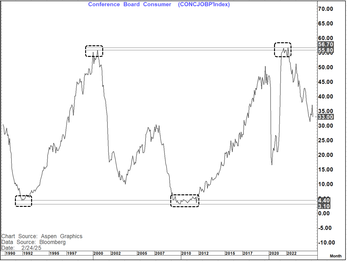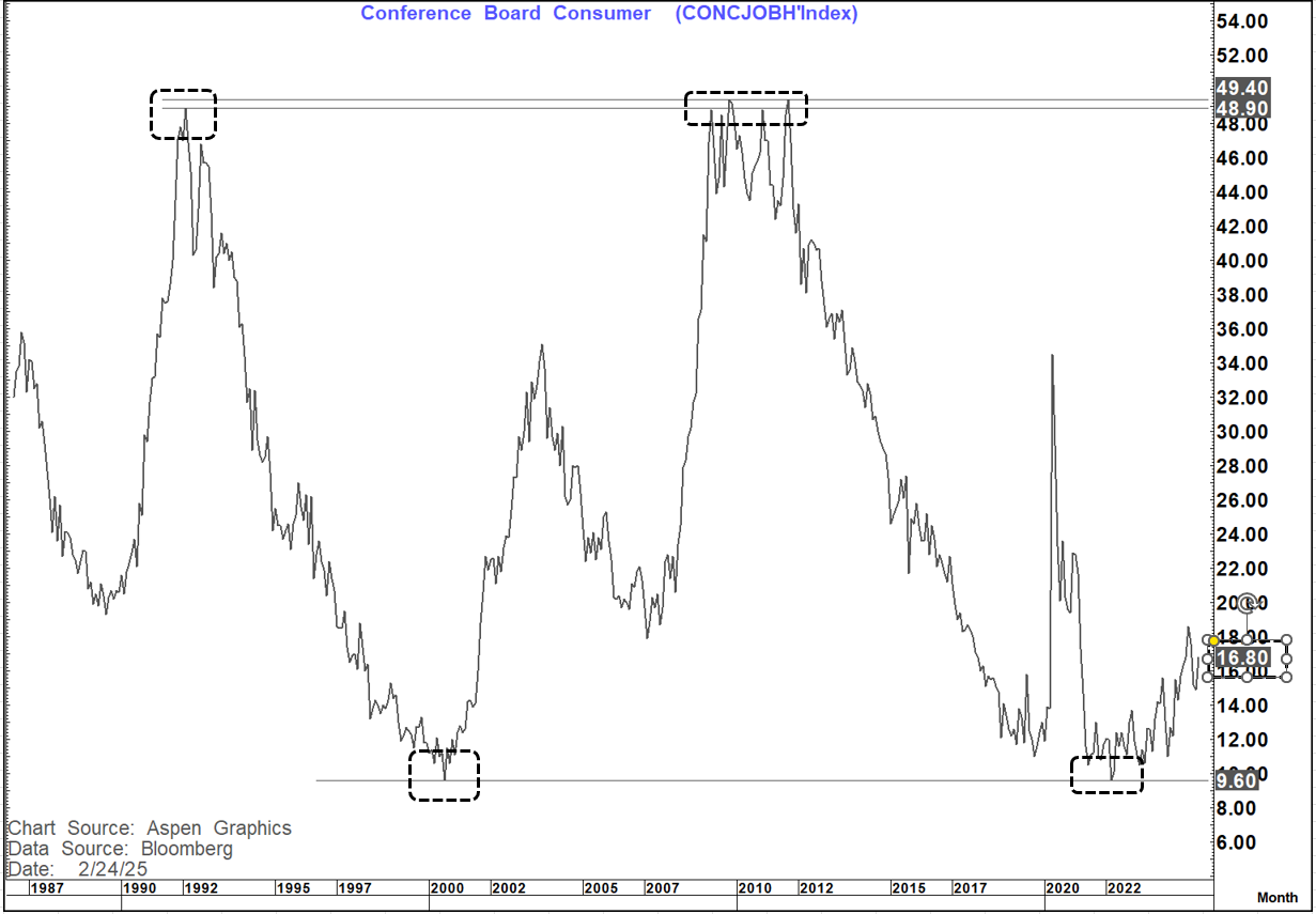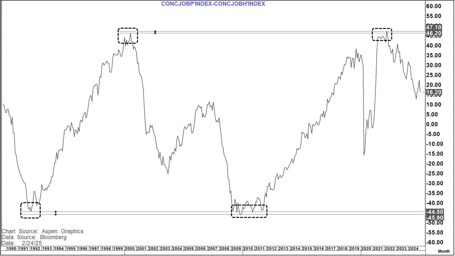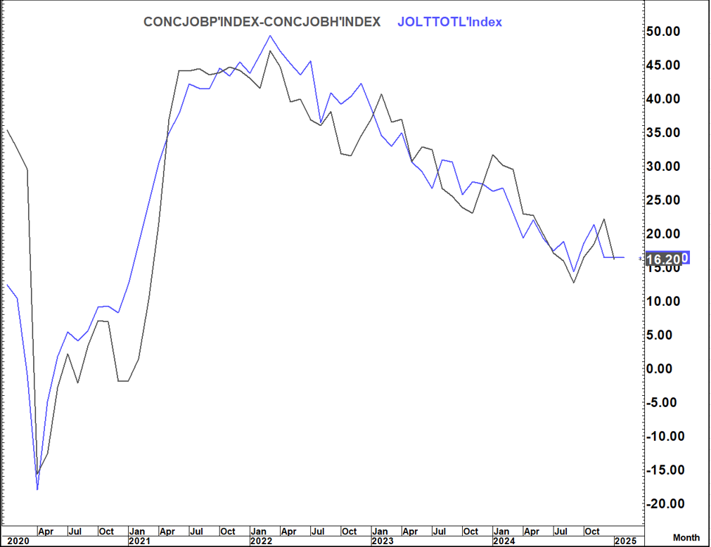 The Jobs Plentiful chart has a very similar picture albeit with a greater level of deterioration. this makes sense as you would expect it to go from plentiful, to less plentiful to hard to get.