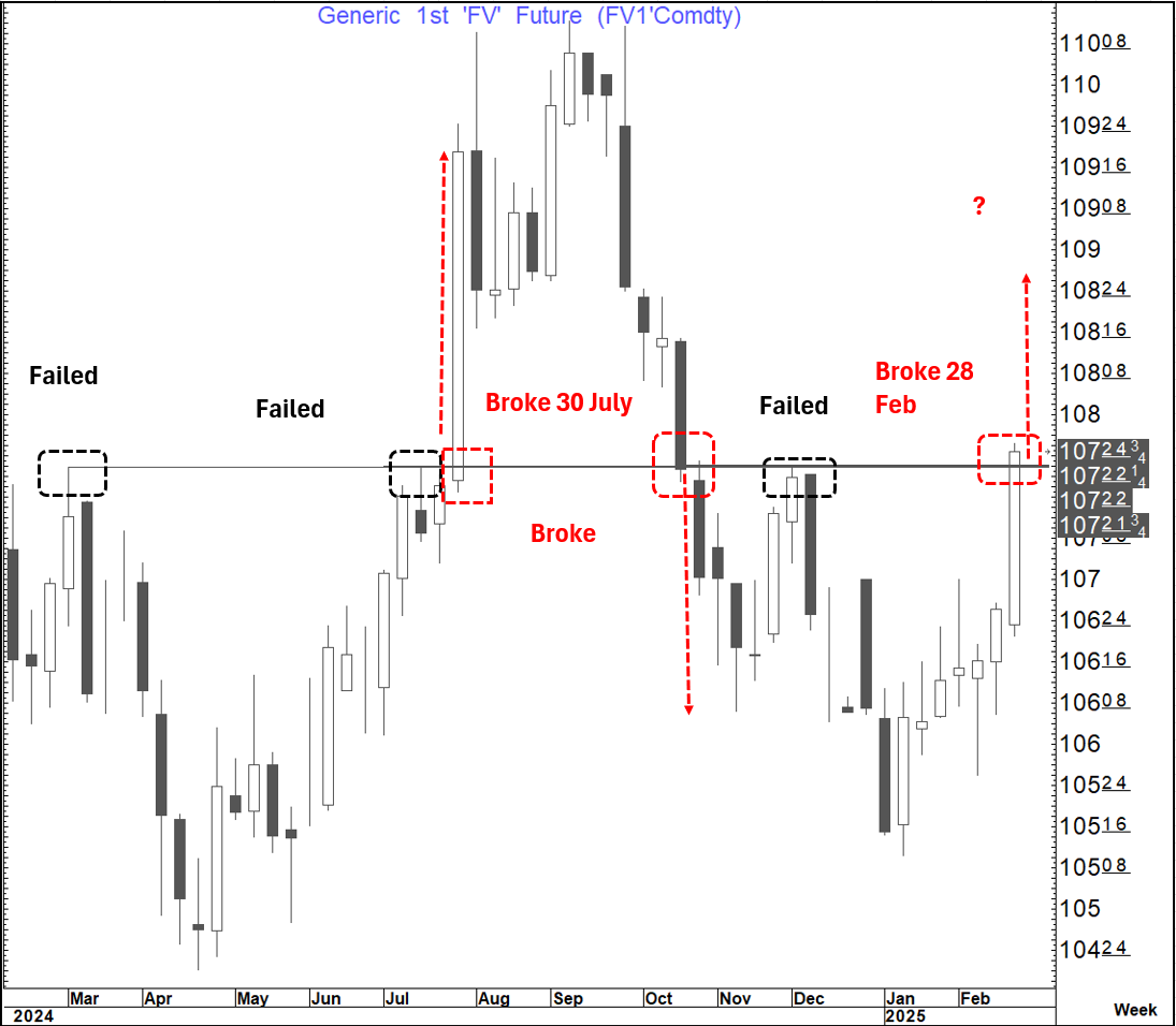 On the 5-year note (FV1) we had a closing break very similar to that seen last July, on Friday
