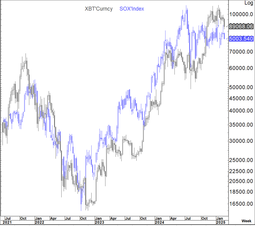 In particular it is worth looking at the overlay of Bitcoin to the most concerning looking Equity market chart out there the SOX (Philadelphia Semiconductor index)