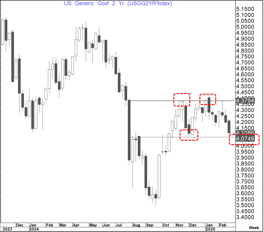 However, IF we see a weekly close under 4.075% that would be a clear double top that would suggest a move as low as 3.70 to 3.75%. That is not happening unless a more aggressive Fed is priced in and if it was to happen soon likely much more aggressive May pricing.