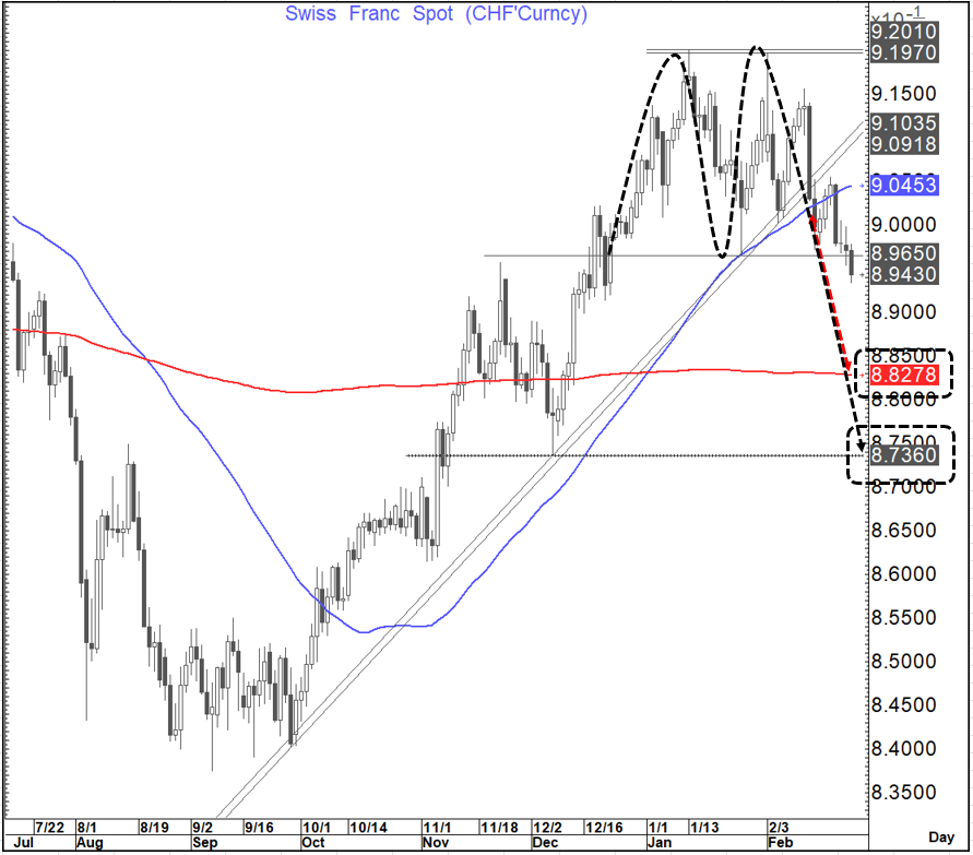 However, one of the best FX charts now is USDCHF which has a 55-200 day MA setup and double top that suggest a move to at least .8828 (200 Day MA) and possibly .8730 (Double top target)