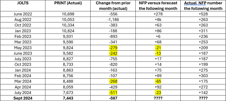 In 11 of the 15 times this has happened since the peak in JOLTS, NFP has beaten the following month. In the 4 times it has missed three of them were minor misses (minus 13 to minus 23k) and one a little higher at minus 65k (April 2024)