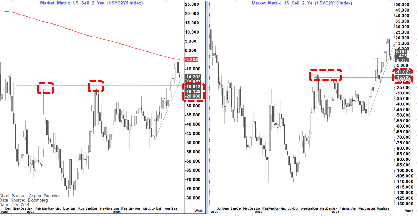 On the 2's 10's curve rising trend line support at +6 bp's has given way as has the initial +1.5 bp's target. Main support now is met at minus 11 to minus 16 bp's