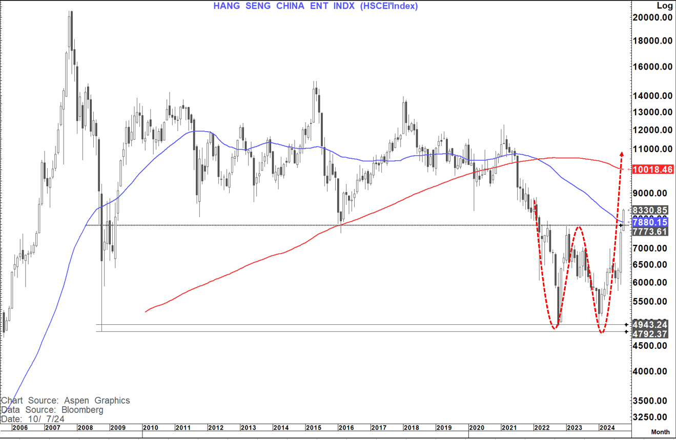 Chinese Equity markets are "On a tear" again. Technically the "Poster Child" to me looks to be the HSCEI index
