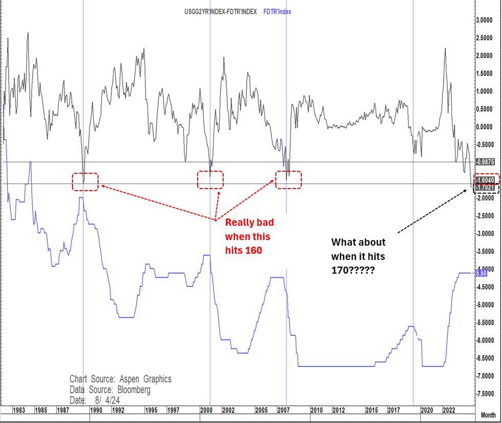 For the last 40-years a 2-year yield below the Fed Funds rate by 160 bp's before the first rate cut has been really bad. What about 170 bp's?