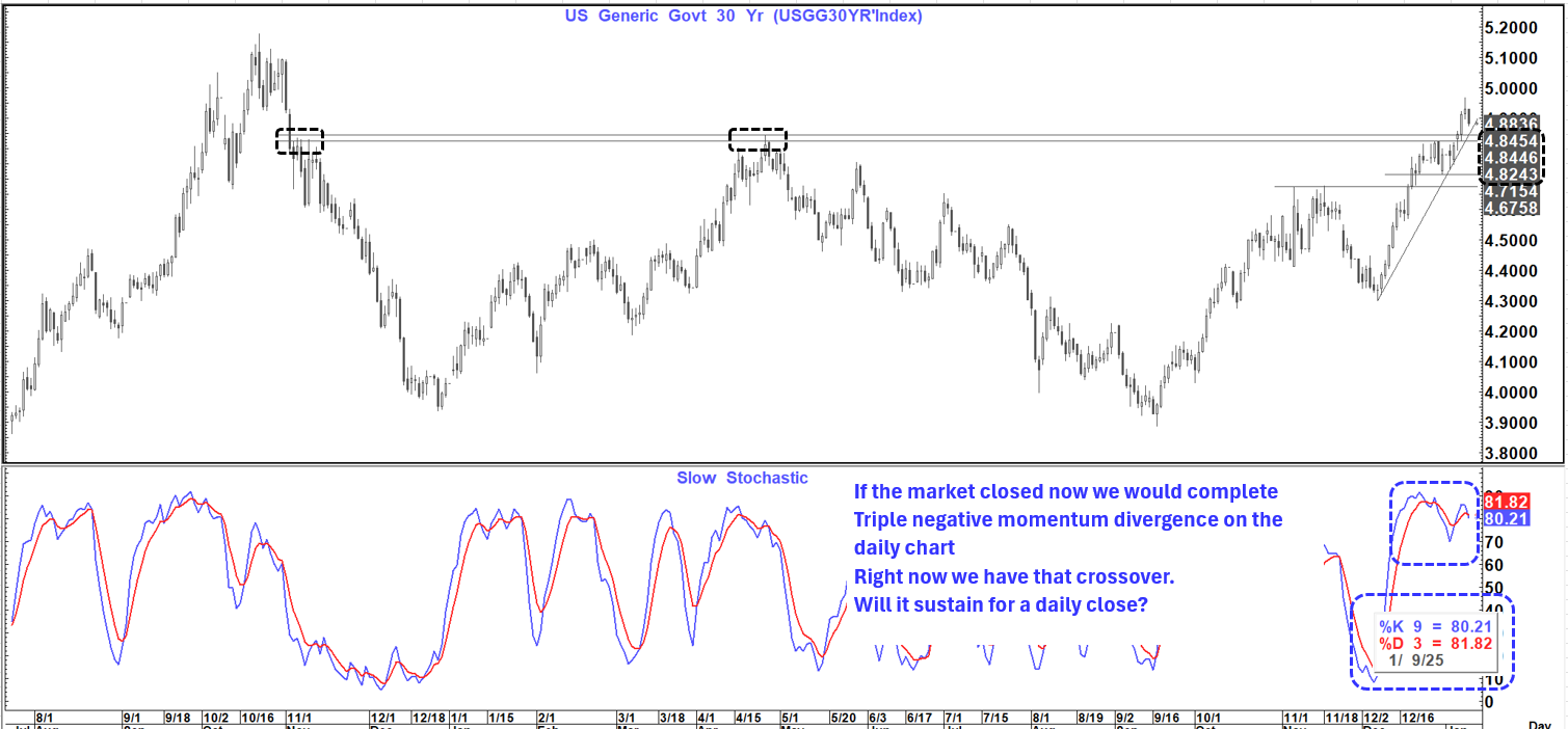 "We have seen what can only be described as an impulsive break through the pivotal 4.845% level on the 30-year yield which suggests a danger of materially higher levels in the weeks ahead. While we still technically need to see a weekly close the reality is that we would likely need an awful employment report and a meltdown in Equities for that to happen."