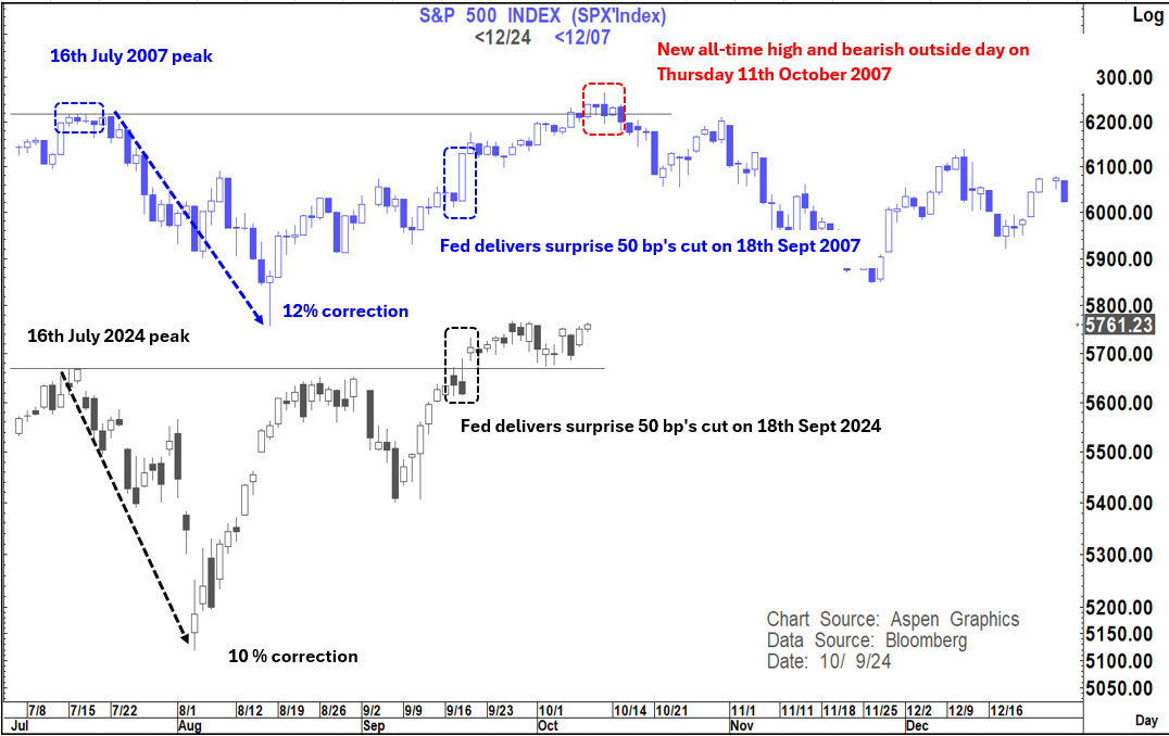 SPX moves to new all-time high, surging after the Fed delivers a surprise 50 bp's on 18th Sept. 2007.