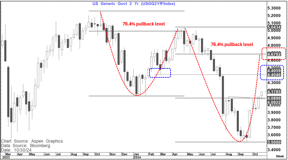 In this piece I stated that IF we saw a weekly close above 4.09%-4.13% in the US 2-year yield then a quick move towards 4.40-4.42% would be a danger