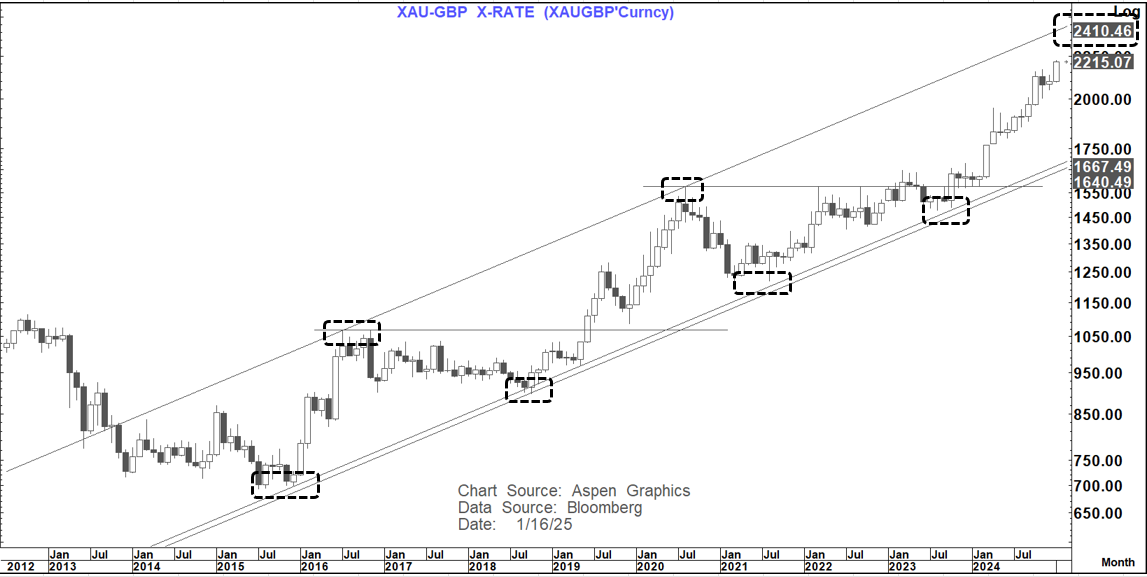 One of my favourite trades in this respect is still long Gold and short GBP as it still looks like the downtrend in GBPUSD is intact (GBP looks soft across the board). That just hit a marginal new all-time high at GBP 2,221 this morning and the long-term channel top at GBP 2,410 looks a valid target here.