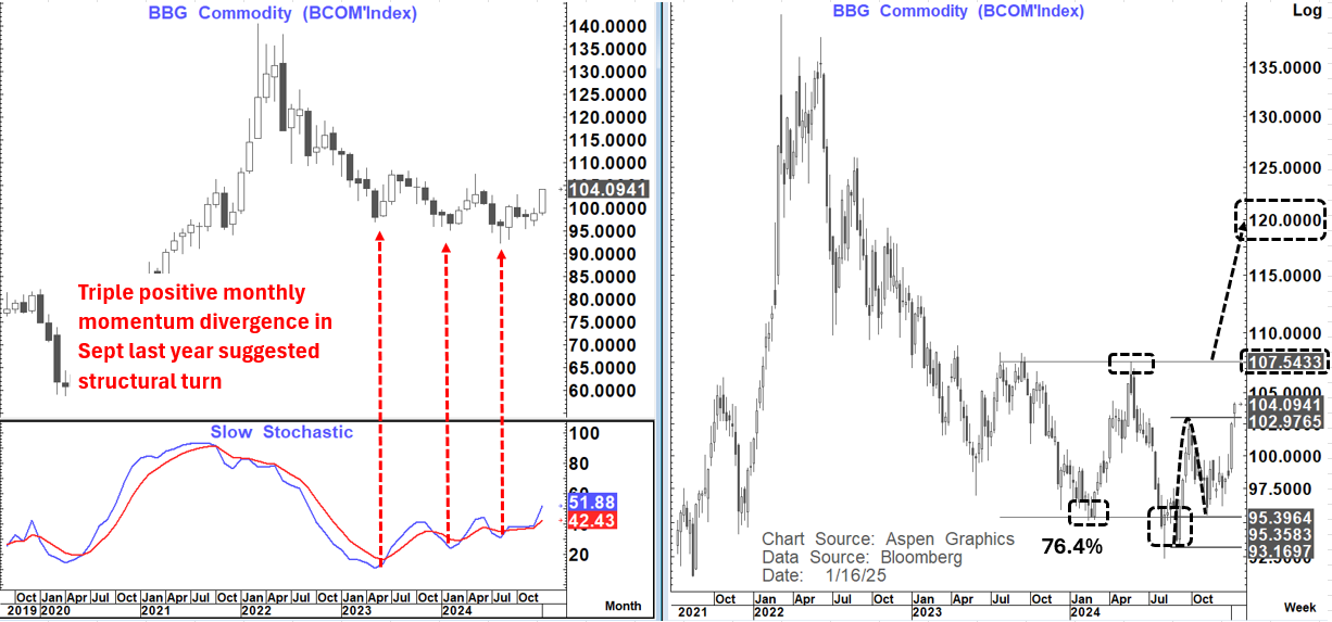 In September we posted triple positive triple momentum divergence on the monthly chart which suggested much higher levels over time. That looks to be materialising now as we have just broken the 76.4% pivot of the recent correction lower and accelerated. A test of the 107.50+ area seen in May last year now looks likely and a break above, if seen, opens up the way for extended gains towards 120.