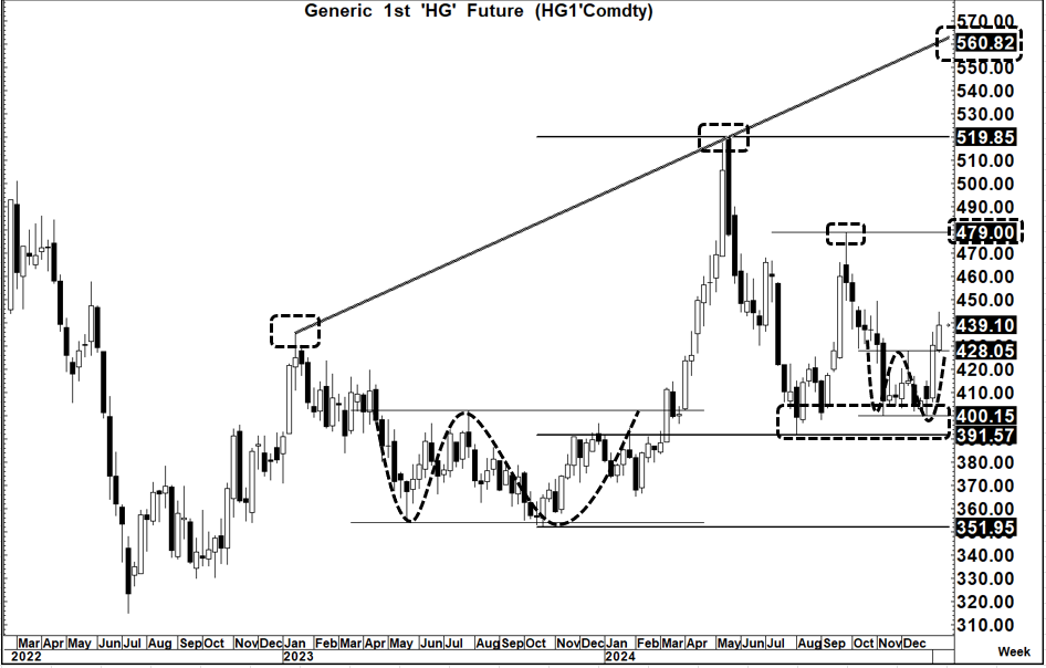 Above $456 would open up the possibility of a test of the Sept. 2024 high at $479 and that is a pivotal level. A decisiive break of that level, if seen, would suggest further material gains targeting $560- also where the trendline off the last two highs in Jan 2023 and May 2024 comes in. Interim resistance is met at the May 2024 high at $520