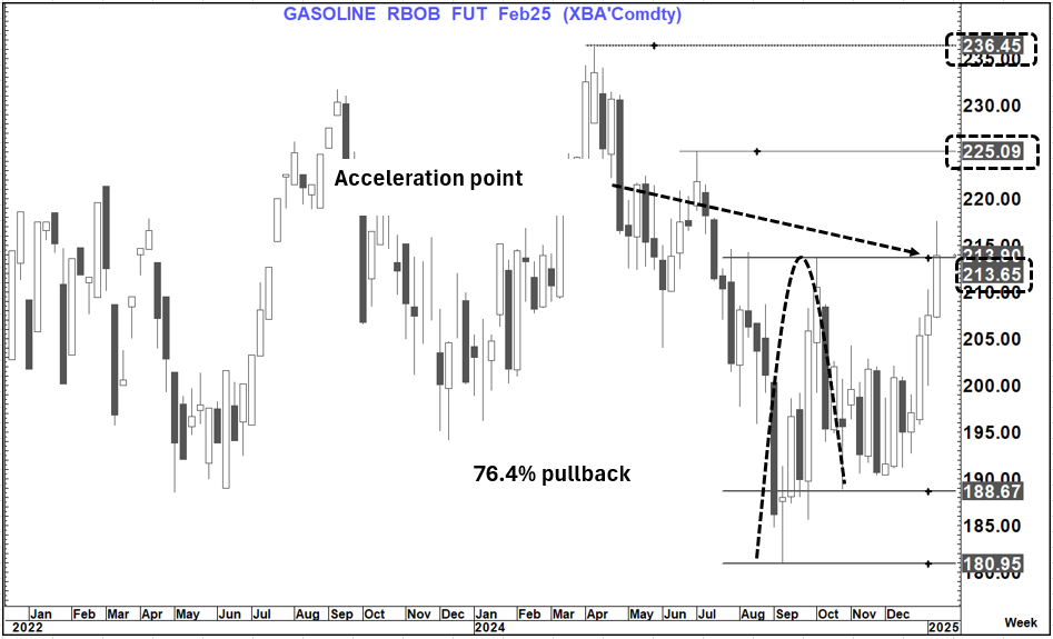 Following a 76.4% pullback Gasoline is now testing the pivot point at $2.1365. A weekly close above would suggest further gains (impulsive) to at least $2.25 and possibly the 2024 highs at $2.365. Above there the 2022 highs stand at $2.4250