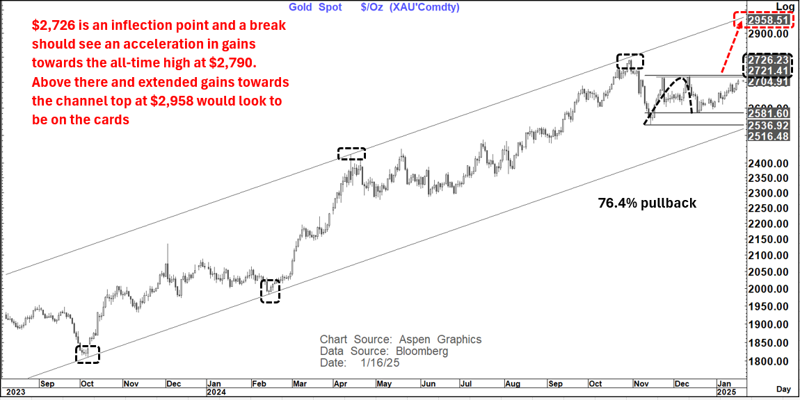 Gold has started to recover nicely in recent days and loos set to imminently test good resistance at $2,721 to $2,726. Having seen the recent pullback falter at the 76.4% retracement level that makes $2,726 a valid acceleration point. A break above would target a rapid move to test the all-time high at $2,790.