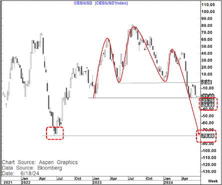 The Citi US ESI (Economic surprise Index) is rolling over again and is now back down to minus 22.4 (just above the recent low at minus 23.79 and the Jan 2023 low at minus 24.69.