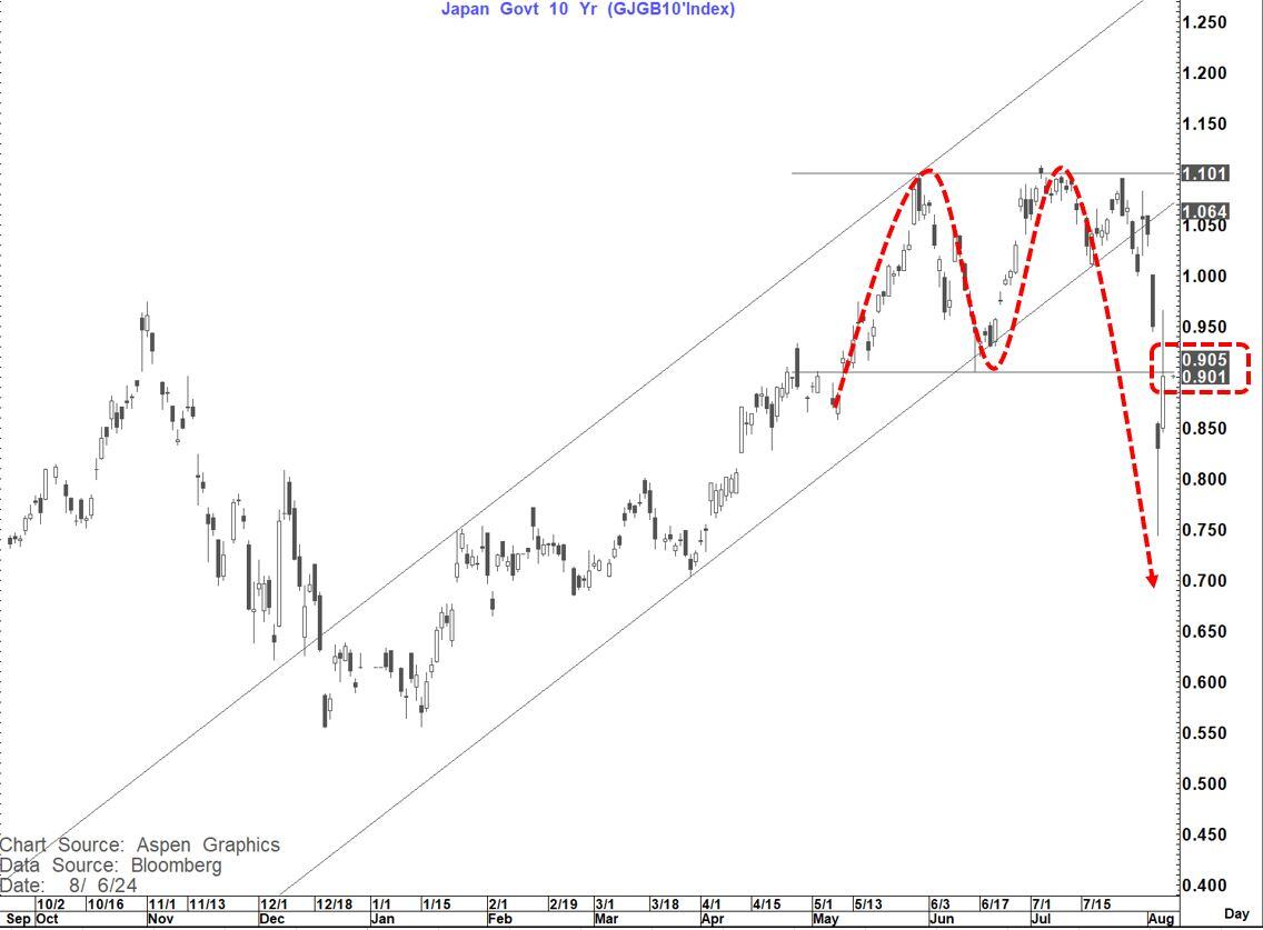 The JGB 10-year yield bounced back to test the double bottom neckline at 90 bp's and has so far held. The target on that double top is for a move to 70 bp's