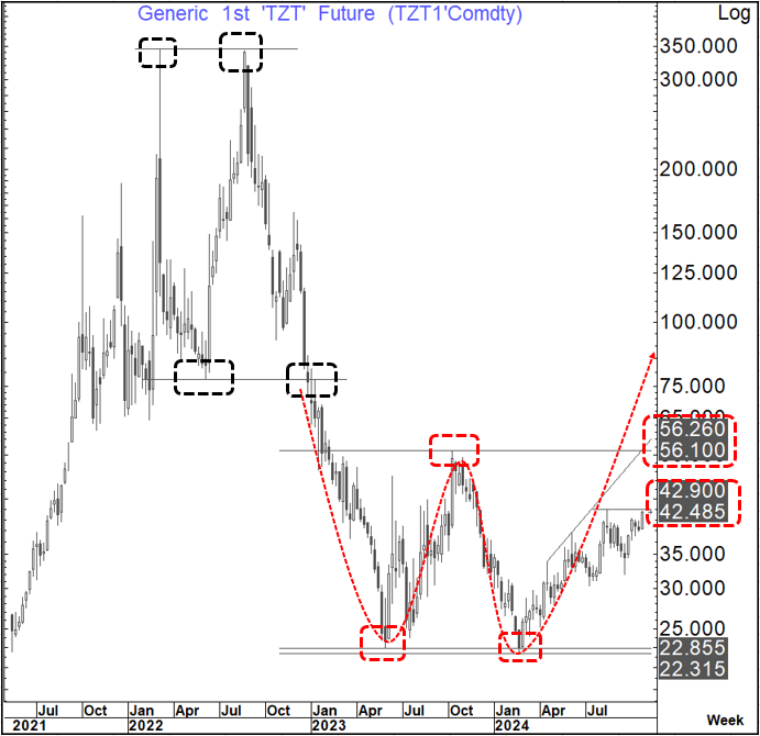 IF we see a weekly close above that level it would suggest that we could go back to test the Oct 2023 high (when yields peaked) at EUR 56.10 (about 32% above this level) and IF we were to see a weekly close above that latter level it would complete a double bottom that would suggest as high as EUR90 again (About 112% above present levels and about 300% above the Feb 2024 low.)